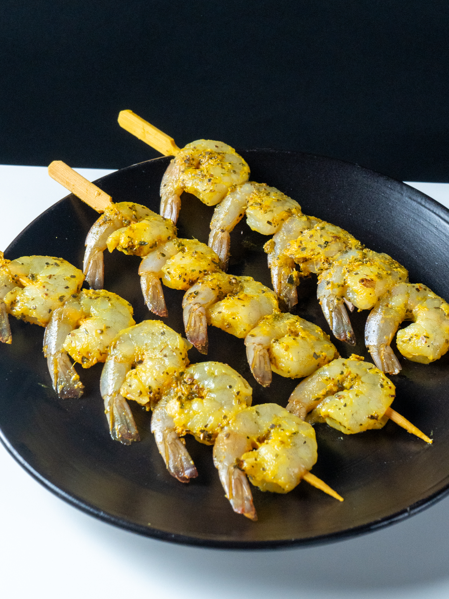 Shrimp processed and marinated with herbs and spices prior to freezing.